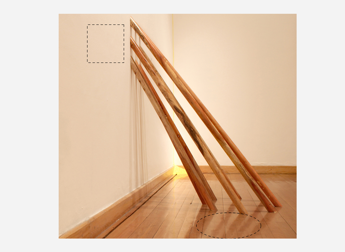 Wooden sticks arranged to show on the wall a square and on the floor a circle. Variables measures.